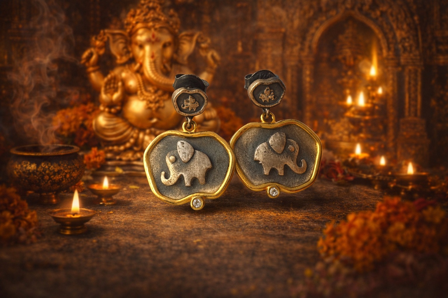 GANESHA KÜPE | 925 AYAR GÜMÜŞ ÜZERİ KARARTMA VE ALTIN KAPLAMA