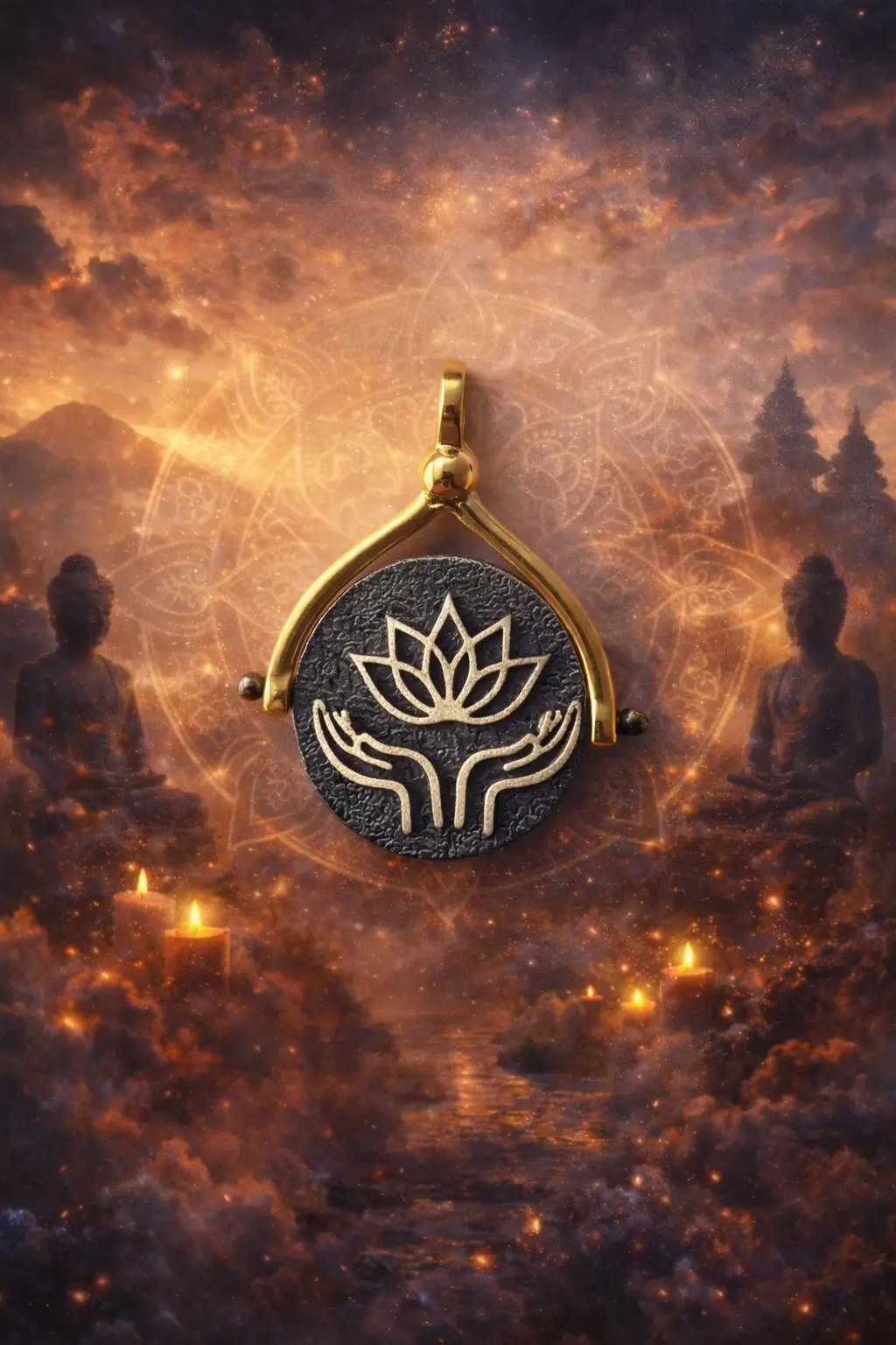 Lotus ve koruyucu eller sembolü; ruhsal uyanışı, içsel gücü ve ilahi korumayı temsil eder. Zorluklardan güçlenerek çıkmayı, kalp enerjisini ve şefkatle desteklenen yeni başlangıçları simgeler. Arka tarafındaki Om sembolü ise evrensel yaşam frekansını, zihinsel sakinliği ve ruh–beden dengesini ifade eder; meditasyon ve farkındalık enerjisini yükselttiğine inanılır.